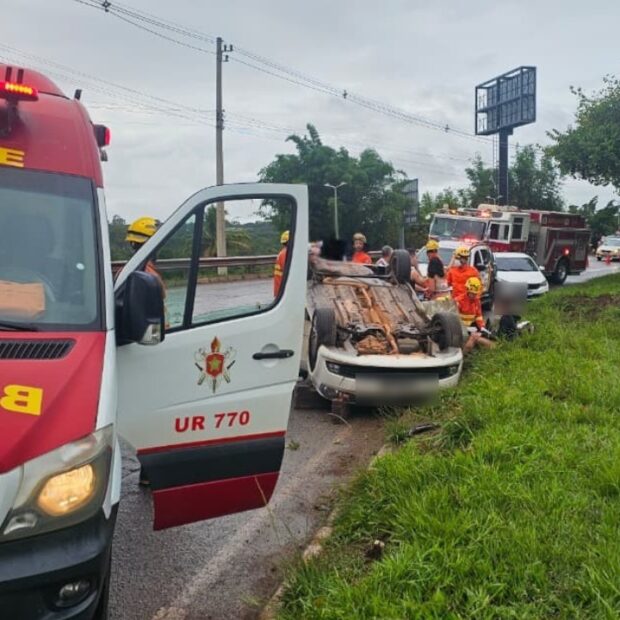 O acidente envolveu três veículos: um VW Gol, um Fiat Argo e um GM Prisma. Após a colisão, os carros bateram na proteção da via, e o VW Gol acabou capotando.