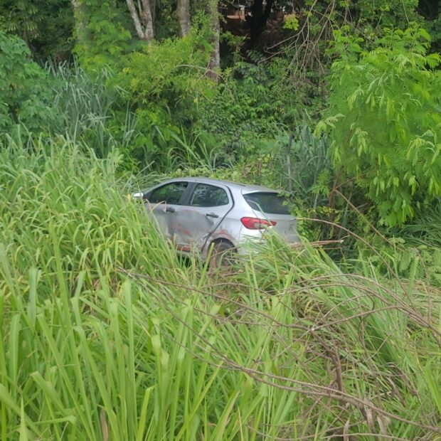 Os bombeiros encontraram um Fiat Argo prata fora da pista após a colisão com um caminhão Mercedes-Benz vermelho. O impacto danificou o carro e feriu o motorista.