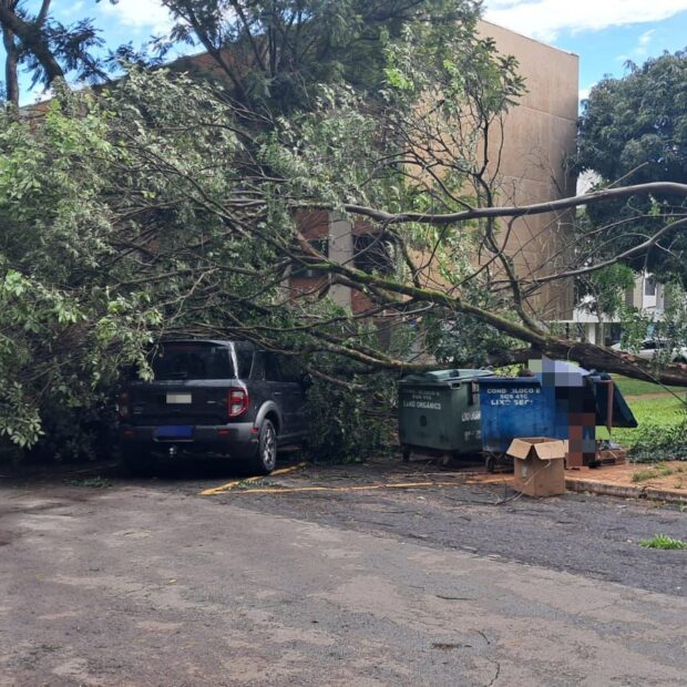 Além das árvores, ventos fortes derrubaram um poste no Itapoã, que atingiu o muro de uma casa.