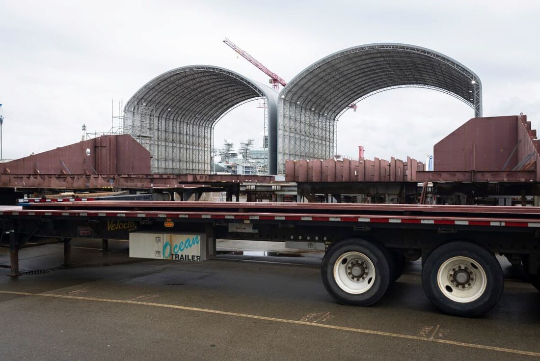 Os quebra-gelos estão sendo construídos em um grande estaleiro em North Vancouver, na costa oeste do país, onde trabalhadores preparam grandes estruturas metálicas.