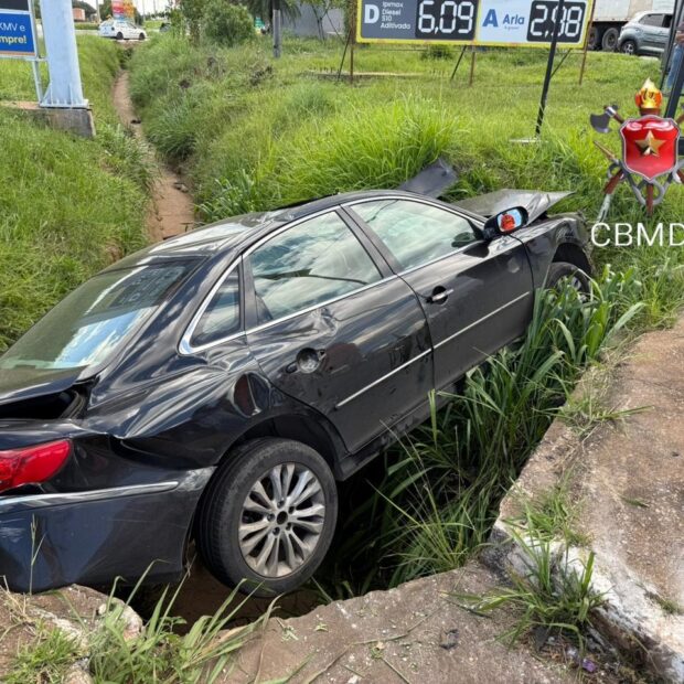 Carro sai da pista e cai em vala na BR-060 em Samambaia