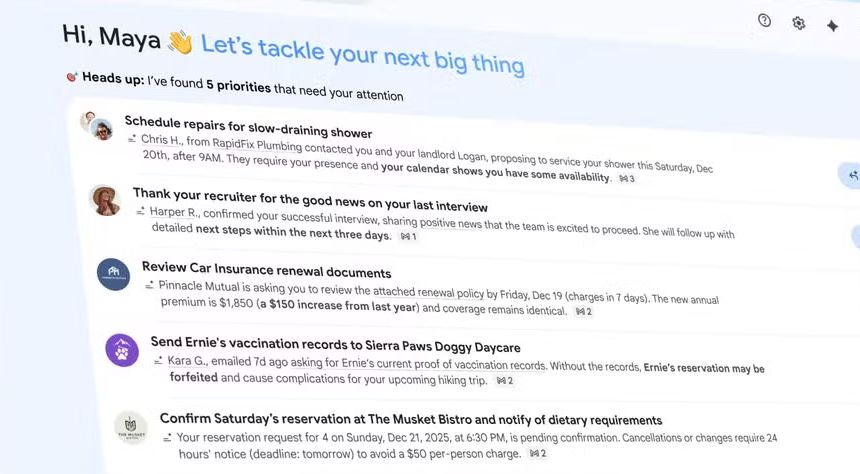 A interface foi atualizada com a adição da “AI Inbox”, uma camada paralela à caixa de entrada tradicional, dividida em duas partes: “Priorities”, que identifica automaticamente e-mails que exigem resposta ou ação rápida; e “Catch me Up”, que apresenta visualmente eventos importantes como viagens, reservas, comprovantes de compra e prazos de devolução.