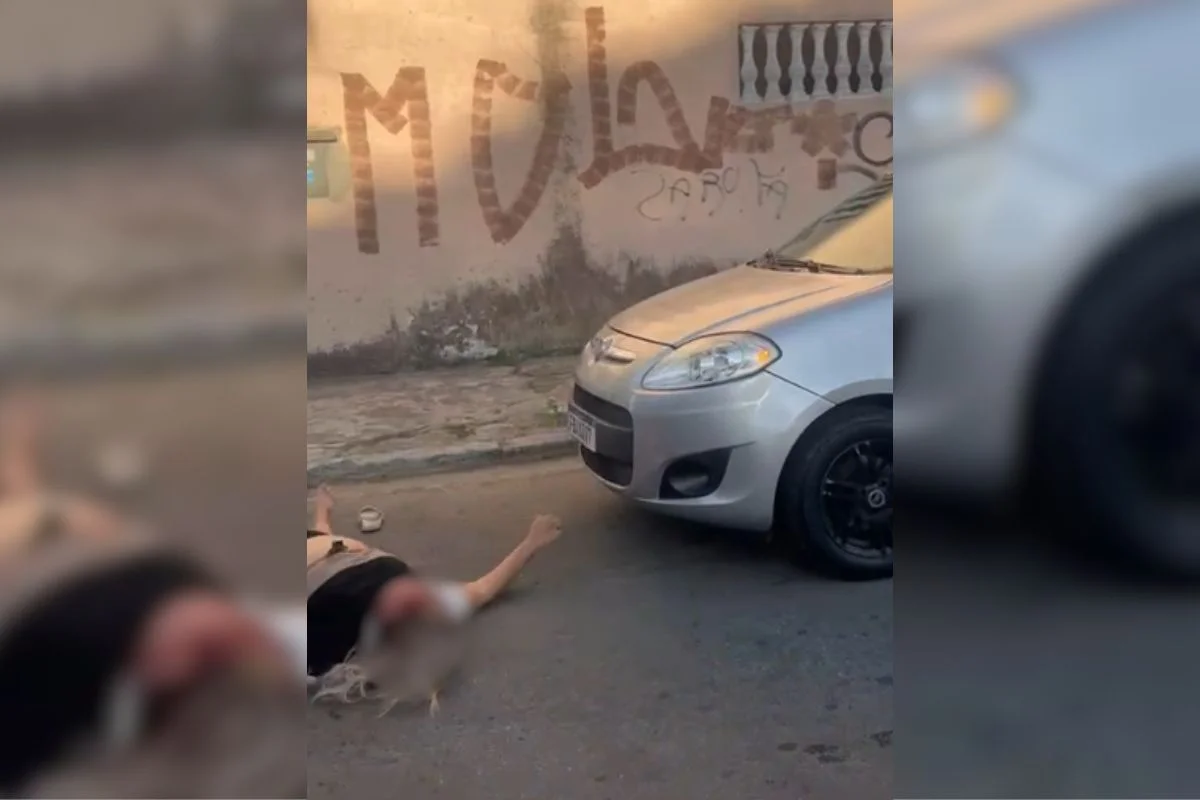 Imagens da data da agressão mostram a mulher caída no chão, com o rosto ensanguentado e visivelmente desorientada. O agressor, identificado como Thiago Pedrosa Dias, de 40 anos, aparece fugindo no carro, deixando a vítima ferida na rua.