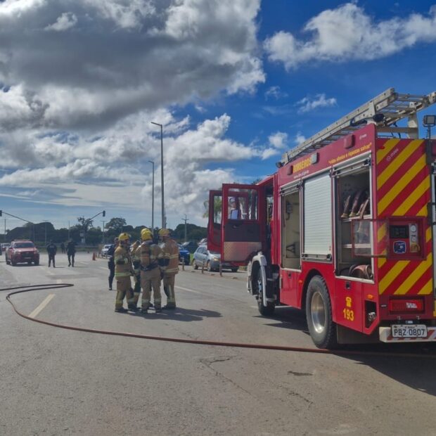 Na manhã desta sexta-feira (13), o Corpo de Bombeiros Militar do Distrito Federal atendeu uma ocorrência de incêndio em um veículo na BR-020, na parte superior do viaduto do Balão do Colorado.