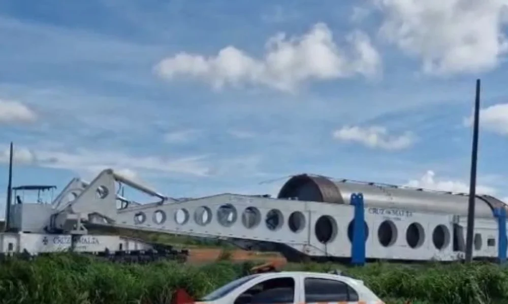 Uma carreta transportando um moinho industrial com peso aproximado de 700 toneladas causou alterações no tráfego das rodovias BR-153 e BR-452, em Goiás, impressionando moradores locais...