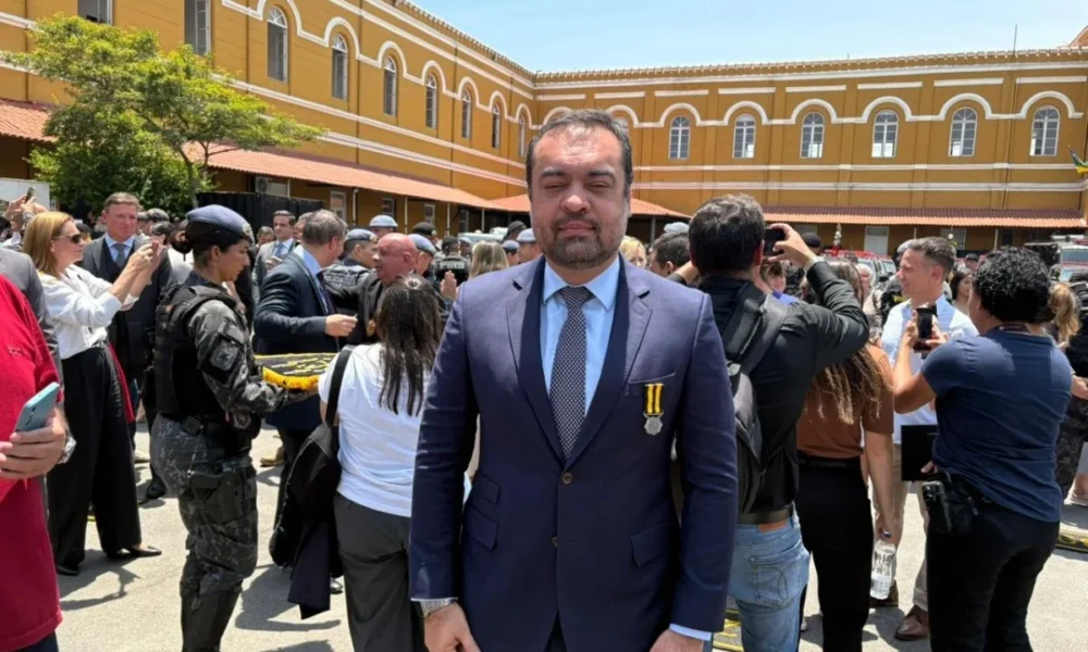 O governador do Rio de Janeiro, Cláudio Castro (PL), seu secretário de Segurança Pública, Victor César, e o presidente da Câmara dos Deputados, Hugo Motta (Republicanos),...