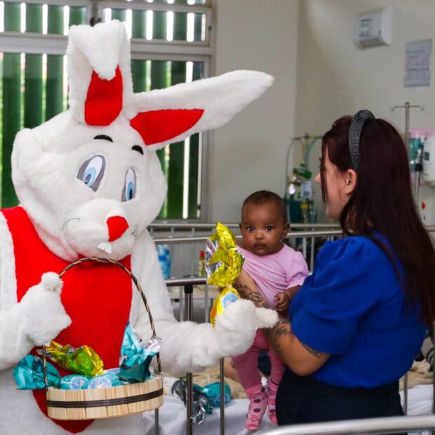 Na véspera da Páscoa, a pediatria do Hospital Regional de Santa Maria mudou sua rotina com uma visita especial na terça-feira (31). O coelhinho da Páscoa passou pelos quartos e corredores, distribuindo chocolates e promovendo atividades como pintura no rosto, oficina de balões e desenhos para colorir, proporcionando momentos felizes para as crianças internadas.