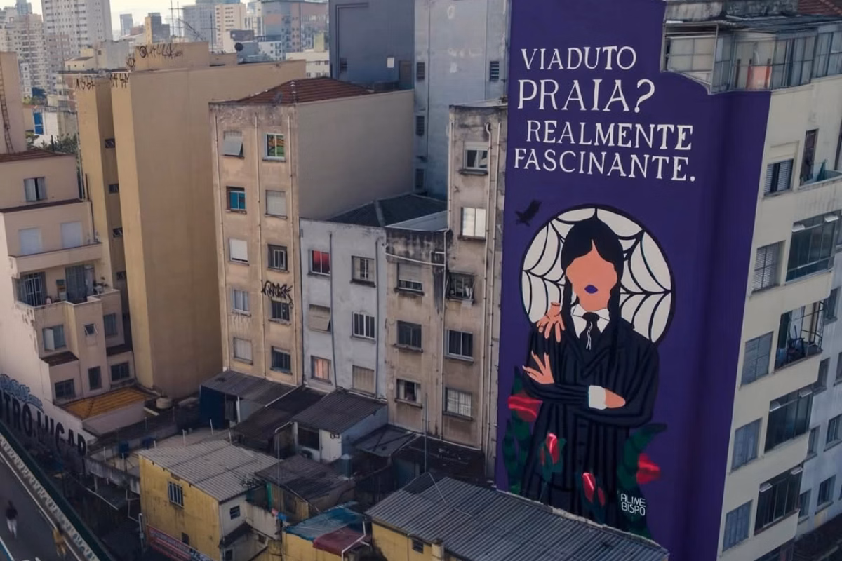 O mural traz a imagem da personagem da Família Addams, que ganhou uma série própria em 2022, interpretada pela atriz Jenna Ortega, acompanhada da frase “Viaduto praia? Realmente fascinante”. Recentemente, o primeiro episódio da segunda temporada foi lançado na plataforma.