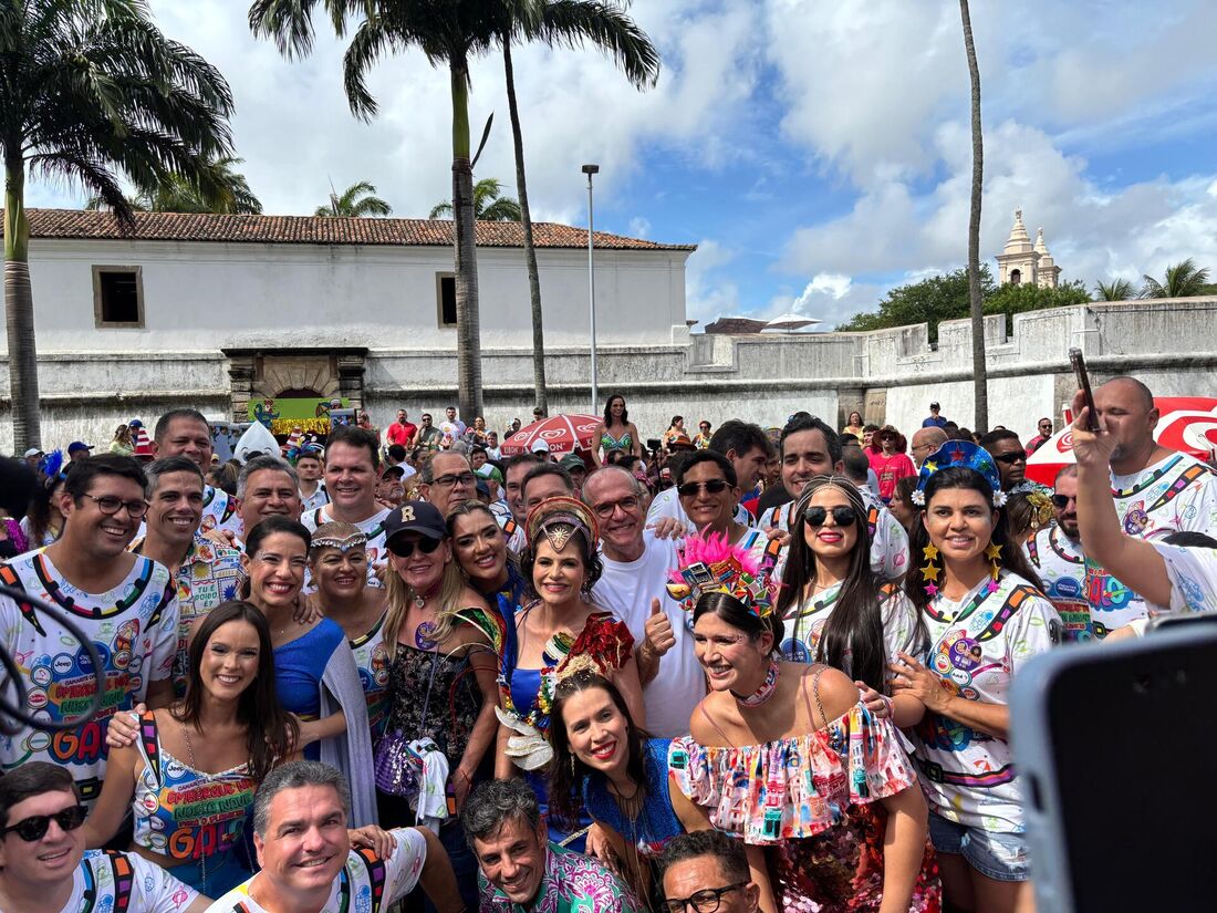 Raquel Lyra, vestindo a bandeira de Pernambuco, marcou presença no desfile do Galo da Madrugada neste sábado de Zé Pereira.