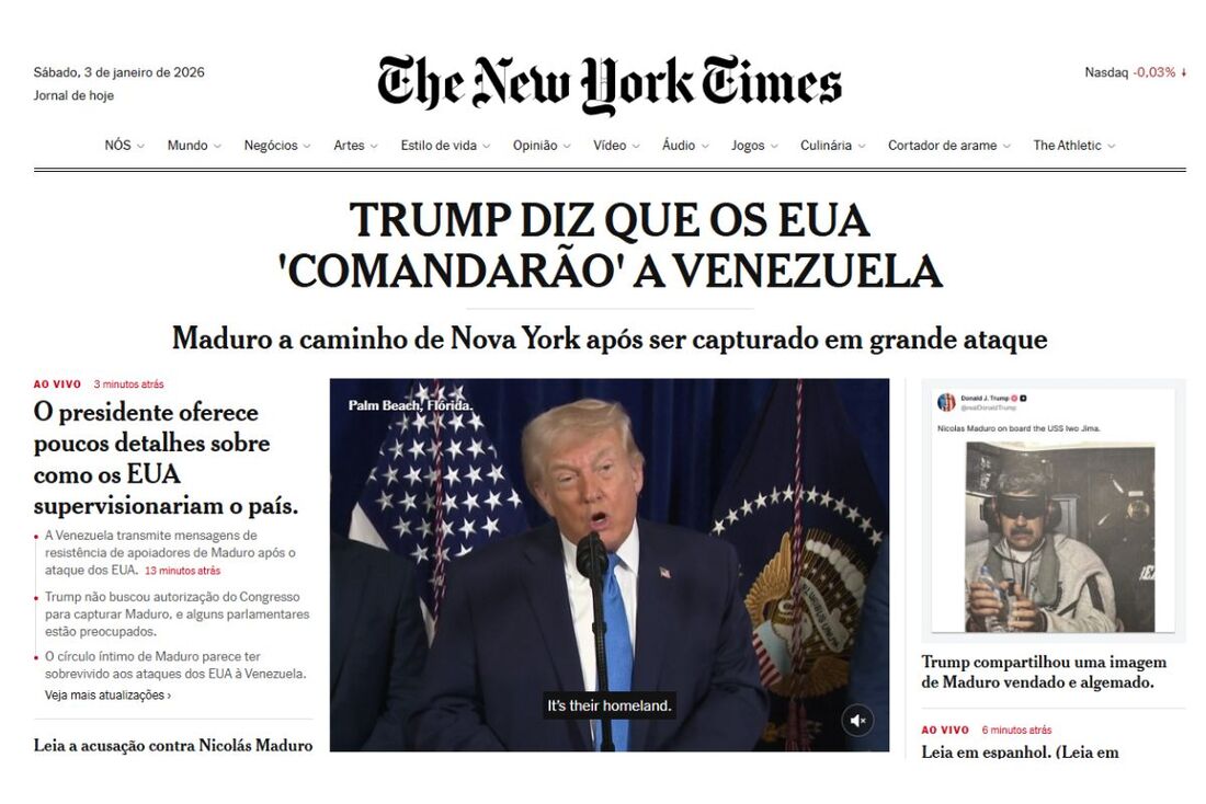 O New York Times, um dos principais jornais dos Estados Unidos, publicou um editorial no sábado (3) criticando duramente as ações do governo Donald Trump contra a Venezuela, qualificando o ataque como ilegal e perigoso. Segundo o jornal, a Venezuela foi o primeiro país a sofrer a nova política de segurança da Casa Branca para a América Latina.